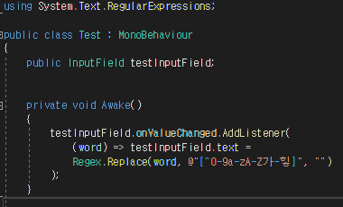 (word) => testInputField.text = Regex.Replace(word, @"[^0-9a-zA-Z가-힣]", "")