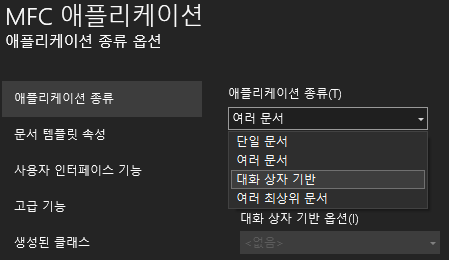 "MFC 애플리케이션"에서 애플리케이션 종류를 대화상자 기반 설정.